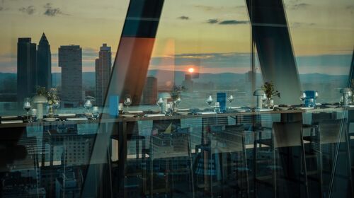 Am Frankfurter Westhafen lässt sich direkt am Main in einmaliger Atmosphäre Zusammenkommen, Genießen und Verweilen. Das eindrucksvolle Gebäude am Flussufer